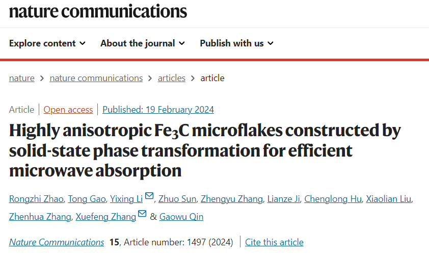 近日,Nature Communications在线刊登了我校材料与环境工程学院张雪峰教授团队的研究论文“Highly anisotropic Fe3C microflakes constructed by solid-state phase transformation for efficient microwave absorption”。该工作利用电化学腐蚀去合金化方法从传统共析钢中获得了磁性Fe3C微米片,通过控制等温淬火温度诱导固态相变调控磁性Fe3C微米片的各向异性,并展现出了优异的吸波性能,实现了传统结构材料的功能化应用。